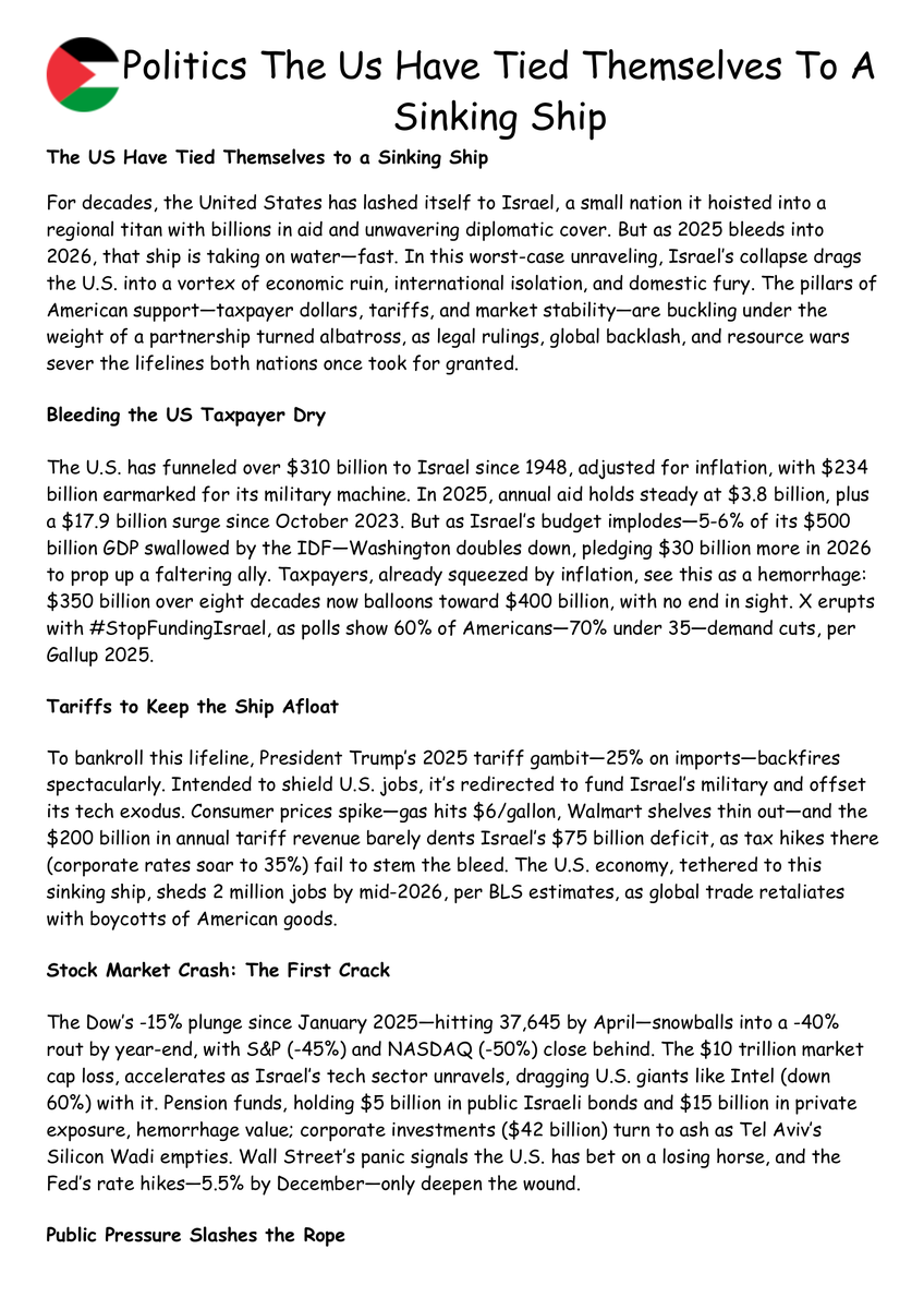 For decades, the United States has lashed itself to Israel, a small nation it hoisted into a regional titan with billions in aid and unwavering diplomatic cover. But as 2025 bleeds into 2026, that ship is taking on water—fast. In this worst-case unraveling, Israel’s collapse drags the U.S. into a vortex of economic ruin, international isolation, and domestic fury. The pillars of American support—taxpayer dollars, tariffs, and market stability—are buckling under the weight of a partnership turned albatross, as legal rulings, global backlash, and resource wars sever the lifelines both nations once took for granted.