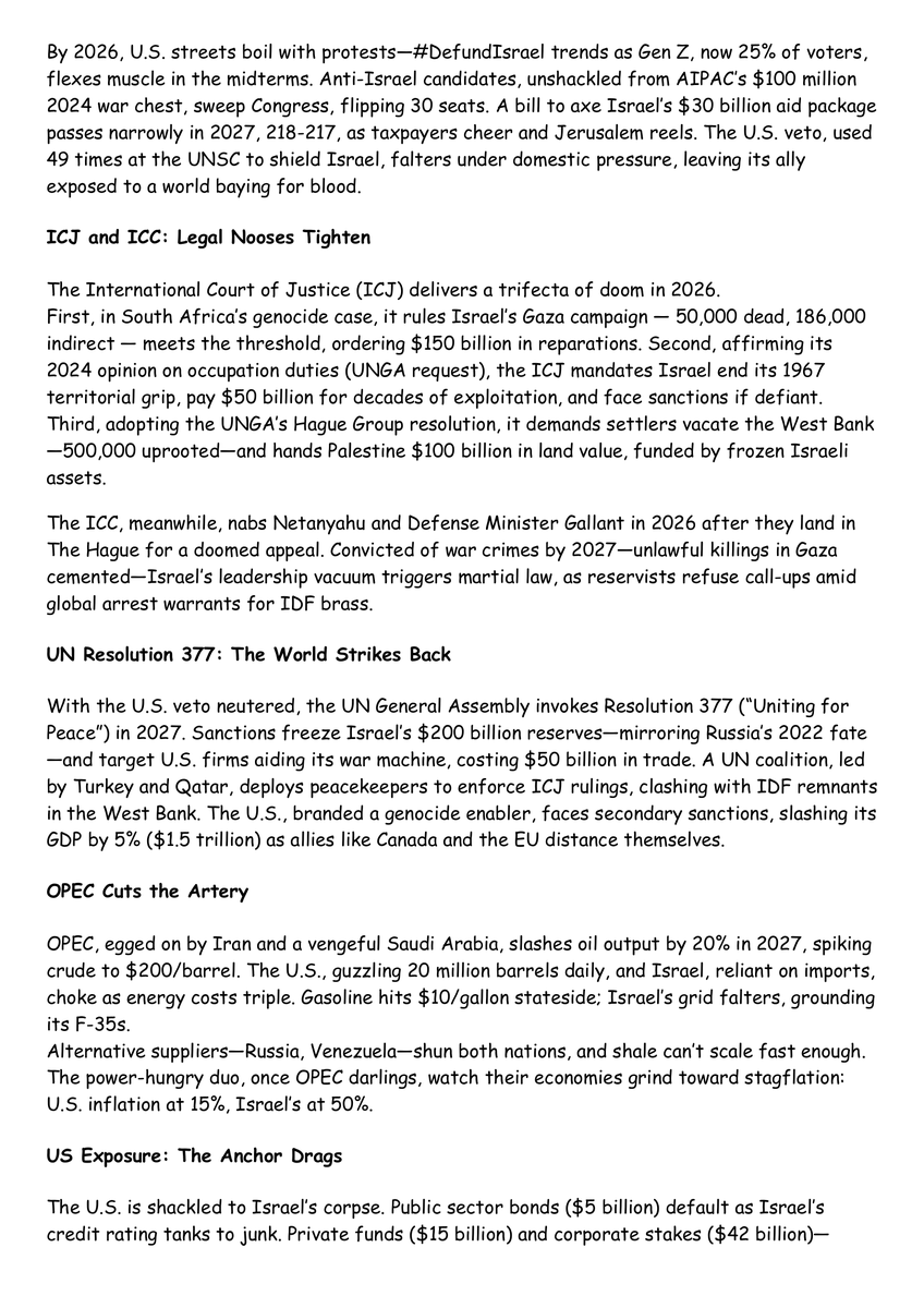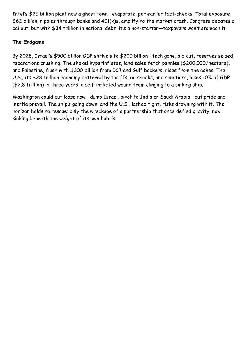 By 2028, Israel’s $500 billion GDP shrivels to $200 billion—tech gone, aid cut, reserves seized, reparations crushing. The shekel hyperinflates, land sales fetch pennies ($200,000/hectare), and Palestine, flush with $300 billion from ICJ and Gulf backers, rises from the ashes. The U.S., its $28 trillion economy battered by tariffs, oil shocks, and sanctions, loses 10% of GDP ($2.8 trillion) in three years, a self-inflicted wound from clinging to a sinking ship.