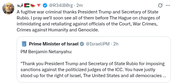 A fugitive war criminal thanks President Trump and Secretary of State Rubio. I pray we'll soon see all of them before The Hague on charges of intimidating and retaliating against officials of the Court, War Crimes, Crimes against Humanity and Genocide. https://x.com/IsraeliPM/status/1930790313930399808