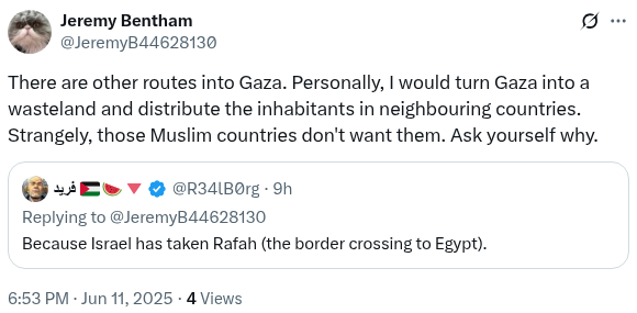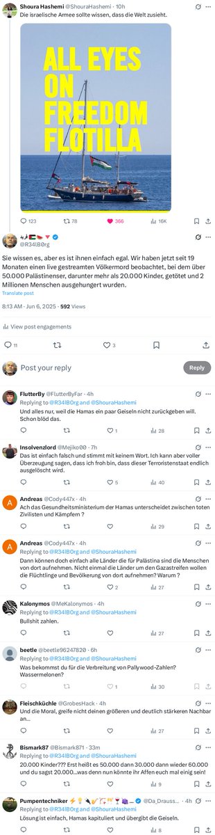 Sie wissen es, aber es ist ihnen einfach egal. Wir mussten jetzt seit 19 Monaten bei einem live gestreamten Vรถlkermord zusehen, bei dem รผber 50.000 Palรคstinenser, darunter mehr als 20.000 Kinder, getรถtet und 2 Millionen Menschen ausgehungert wurden. https://x.com/ShouraHashemi/status/1930867918885036437